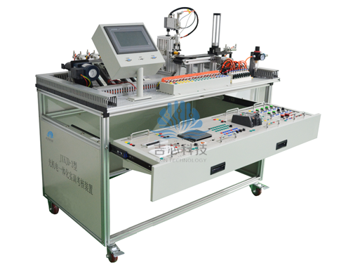 该装置在铝合金导轨式实训台上安装有送料、机械手搬运、材料分拣的三个基本工作机构单元,构成一个典型的自动生产线的机械平台。系统机构采用了气缸驱动、变频器调速驱动、直流电机驱动。系统的控制方式采用了PLC及触摸屏控制等技术。采用模块组合式的结构,各工作单元是相对独立的模块,并采用了标准结构和抽屉式模块,具有较强的互换性。